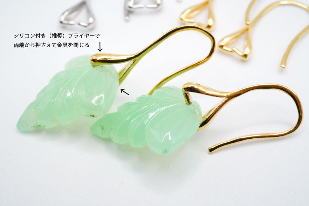 石を挟むときはシリコン付きプライヤー、もしくは金属のみのプライヤーと金具の間にセーム革など柔らかい布を挟んで金具に傷がつかないように作業して下さい。