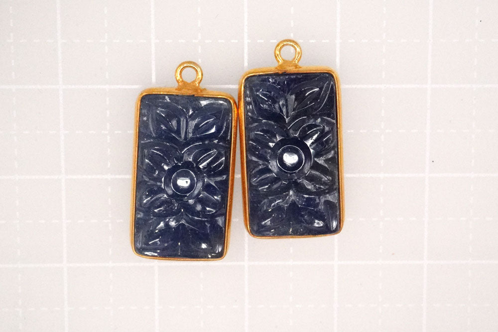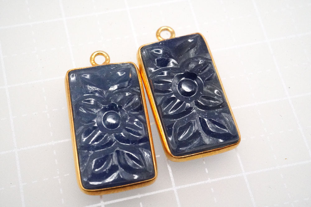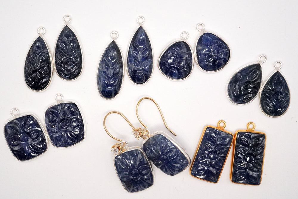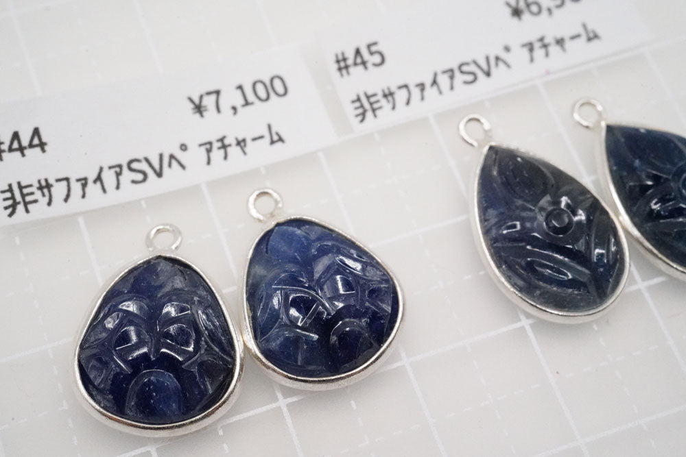 落ち着いた色味の非加熱ブルーサファイアのカービングルースを選びシルバーのフレームをつけたペアチャームです。使用後は柔らかい布で拭いて保管をおすすめします。銀製のため硫化で黒ずみが出ます。その場合は、シルバー用のクリーナーできれいになります。