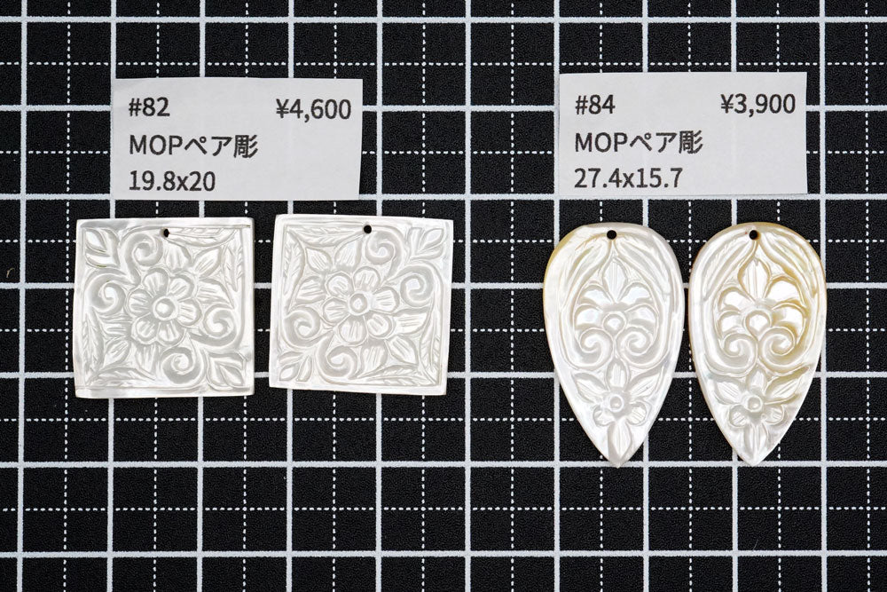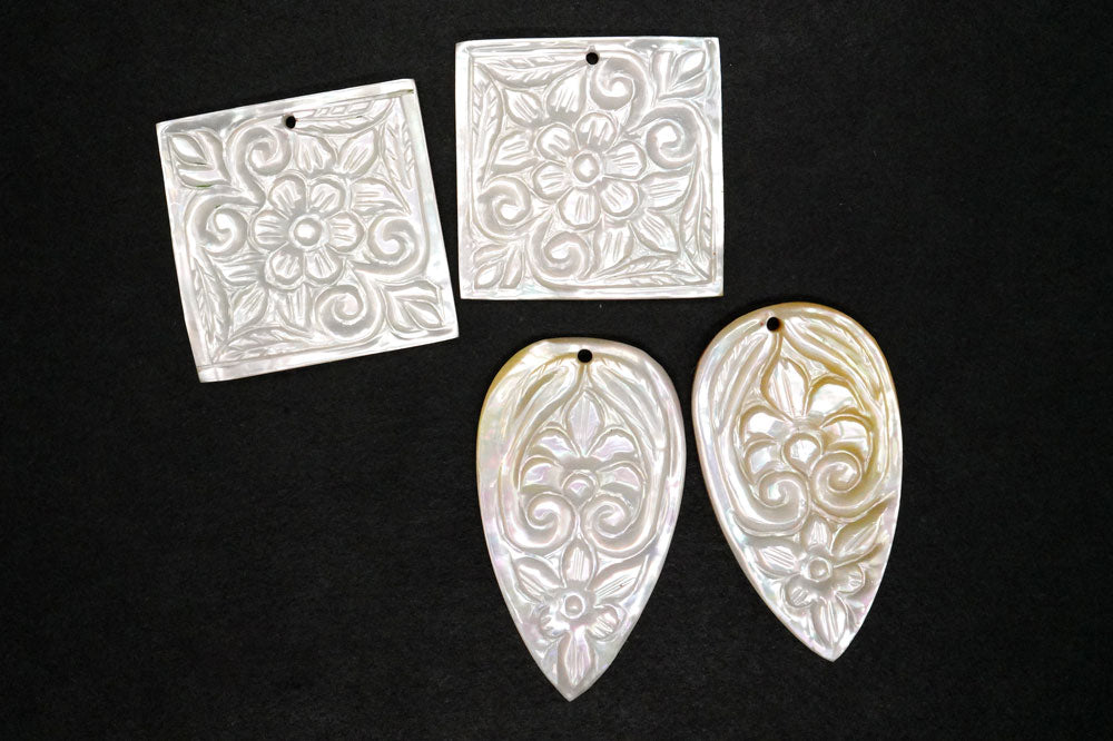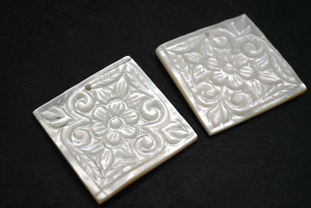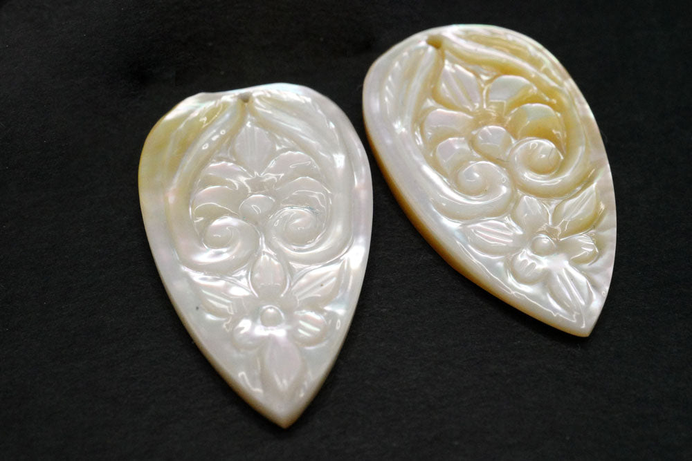 とても美しいボタニカルなデザインのカービングビーズです。白の清楚で可憐な雰囲気のお品です。マザーオブパール(mother of pearl)は真珠が入った母貝のことを指し、MOPと略して呼ばれることもございます。