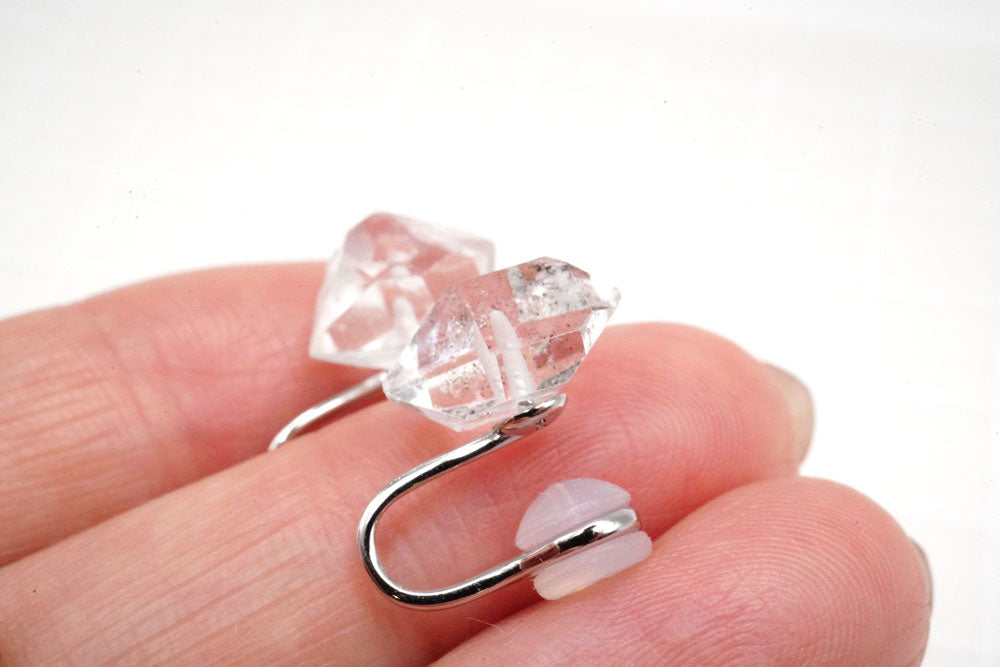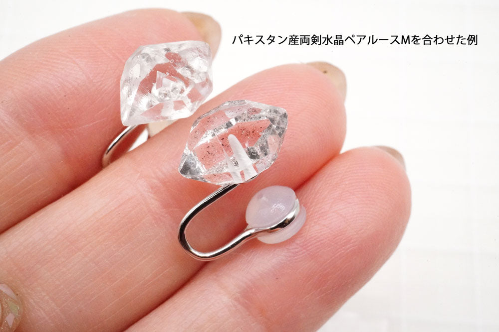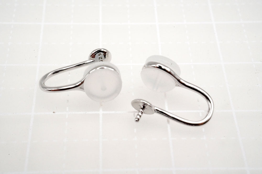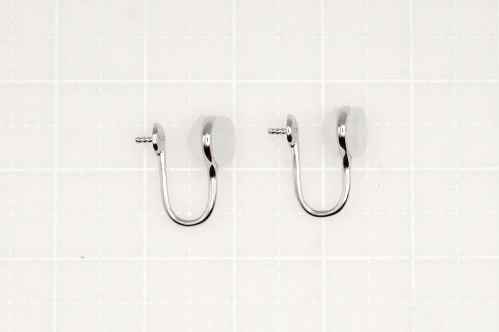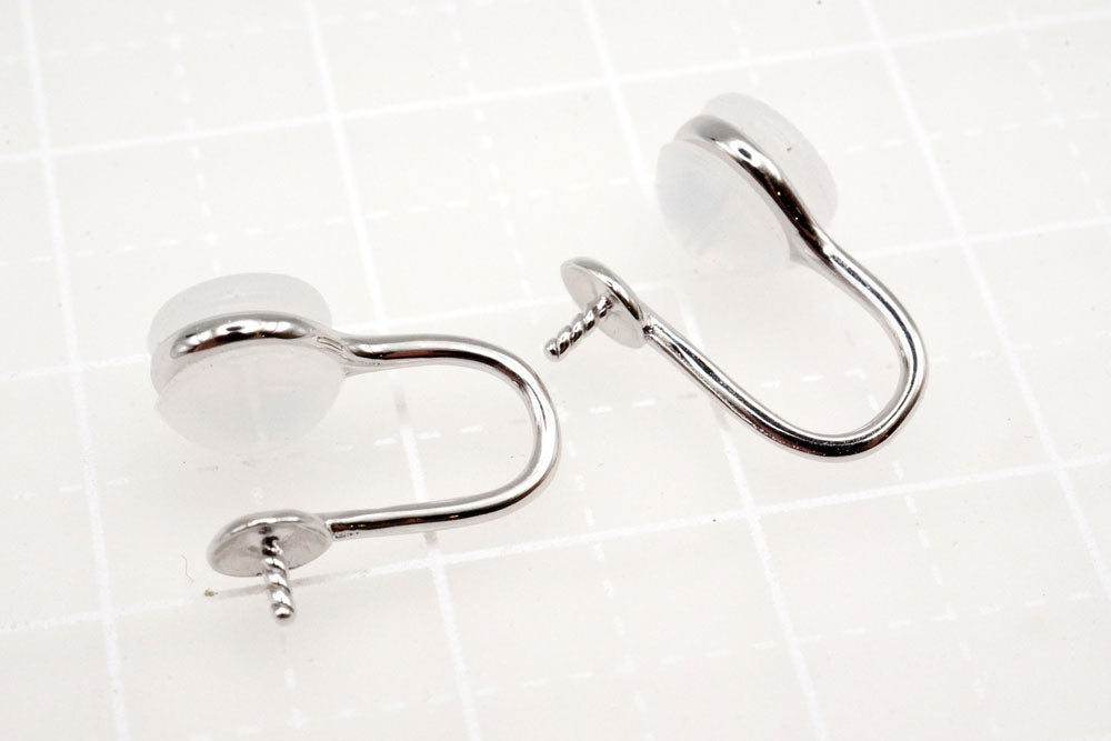 中国産のシルバーイヤークリップ。軽く、金具がなくすっきりとしたデザインです。耳たぶの薄いところから下にスライドしてお使い下さい。片穴のパールや天然石ルースを接着して使用しますが、しっかりとネジで閉まるタイプではありませんので軽量の石やパールをおすすめいたします。金属疲労が起きないよう、何度も開閉せず一度サイズを合わせた後は、サイズ変更はしないでお使い下さい。