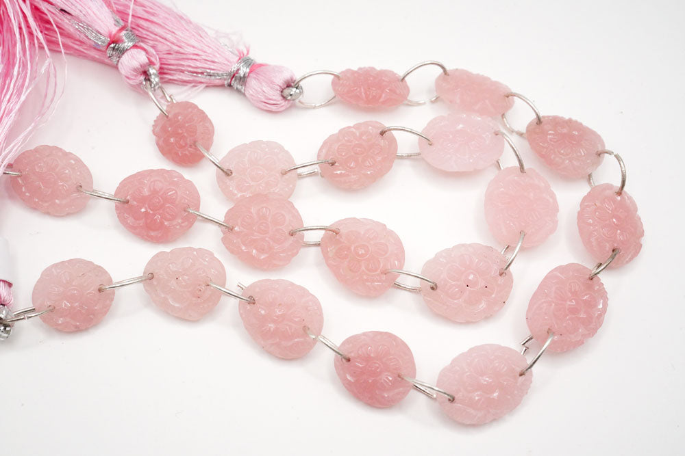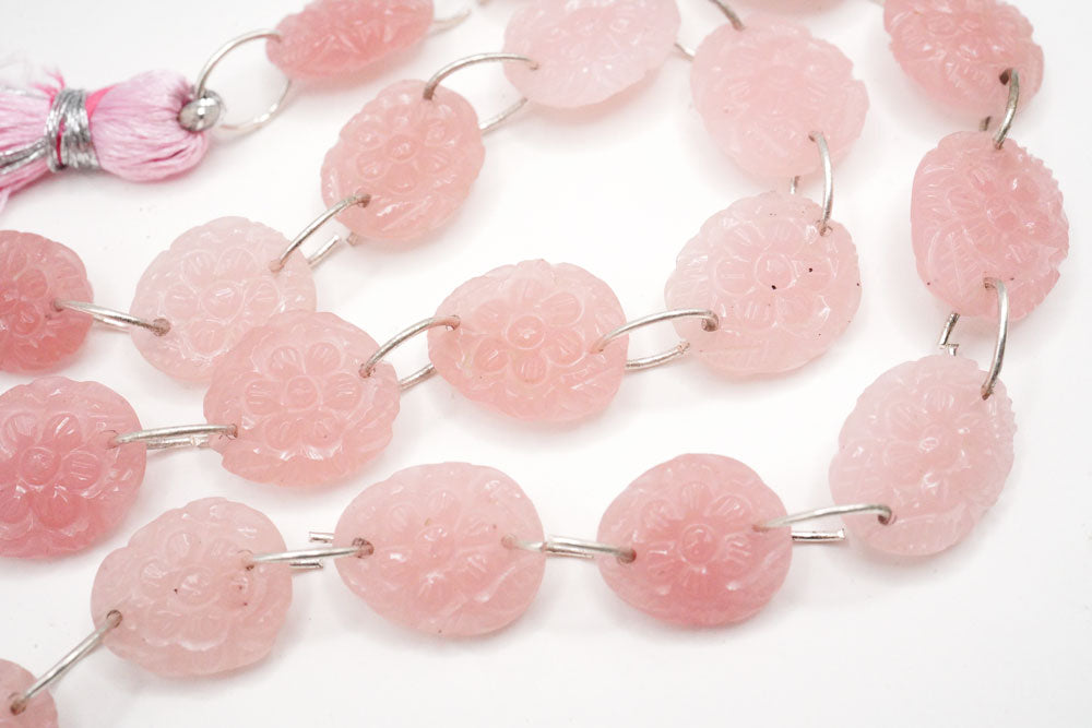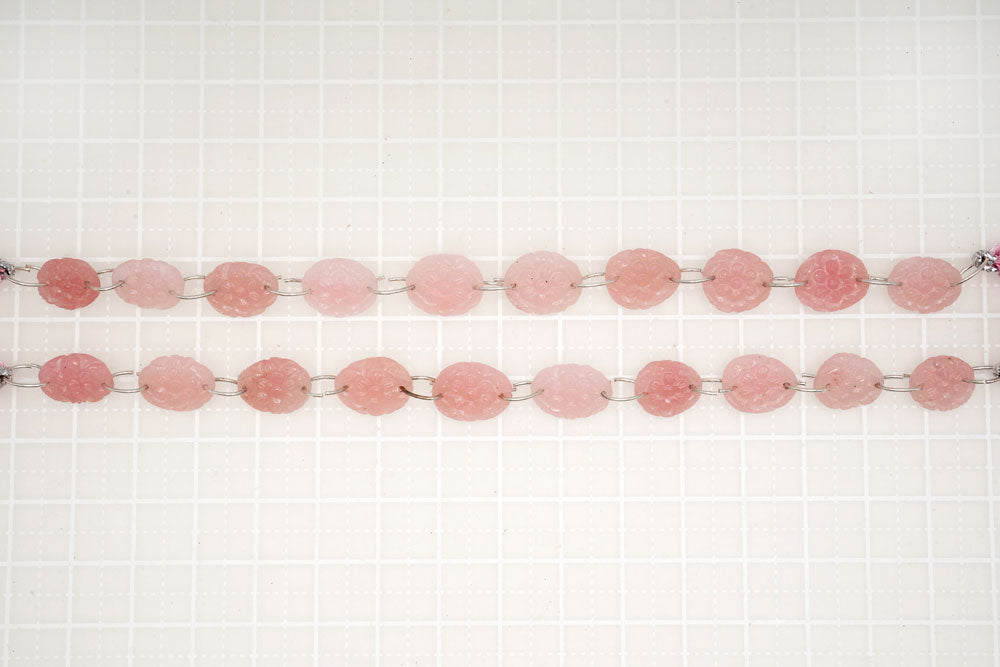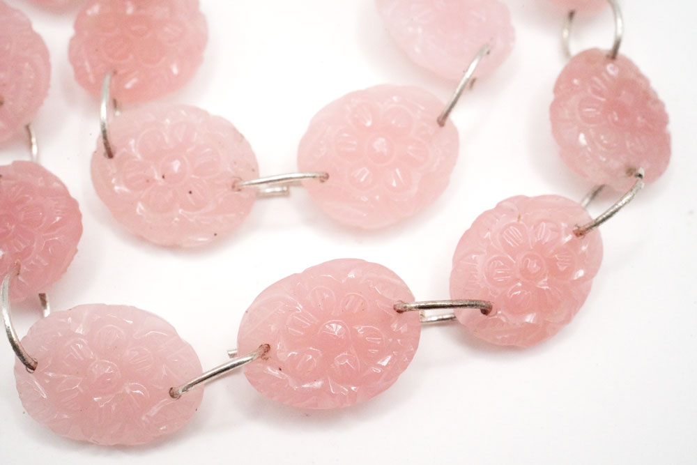 可愛らしいピンクベージュのグァバクォーツに細かなフラワーカービングを施したきれいなビーズ。くすみカラーが肌なじみがよく使いやすいです。2014年に発見された比較的新しい天然石で産地はブラジルです。