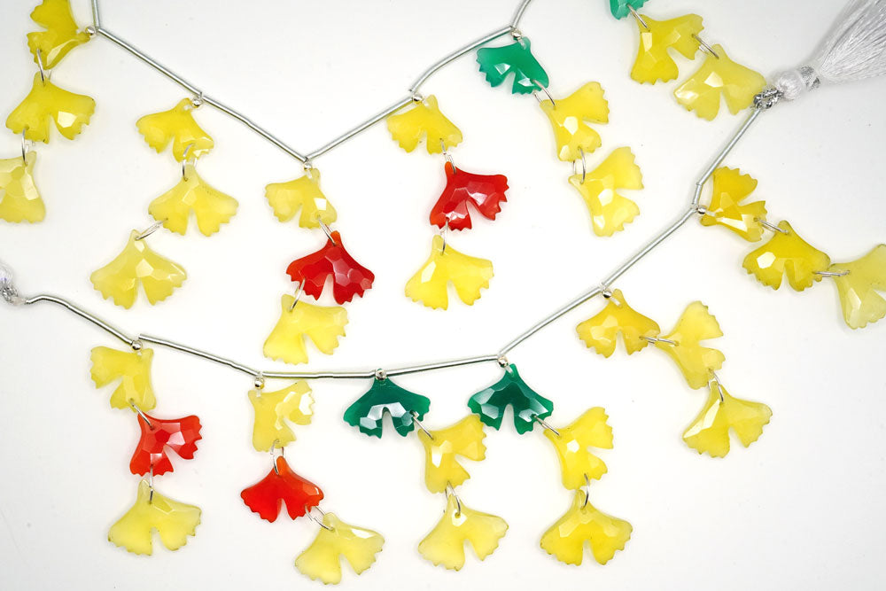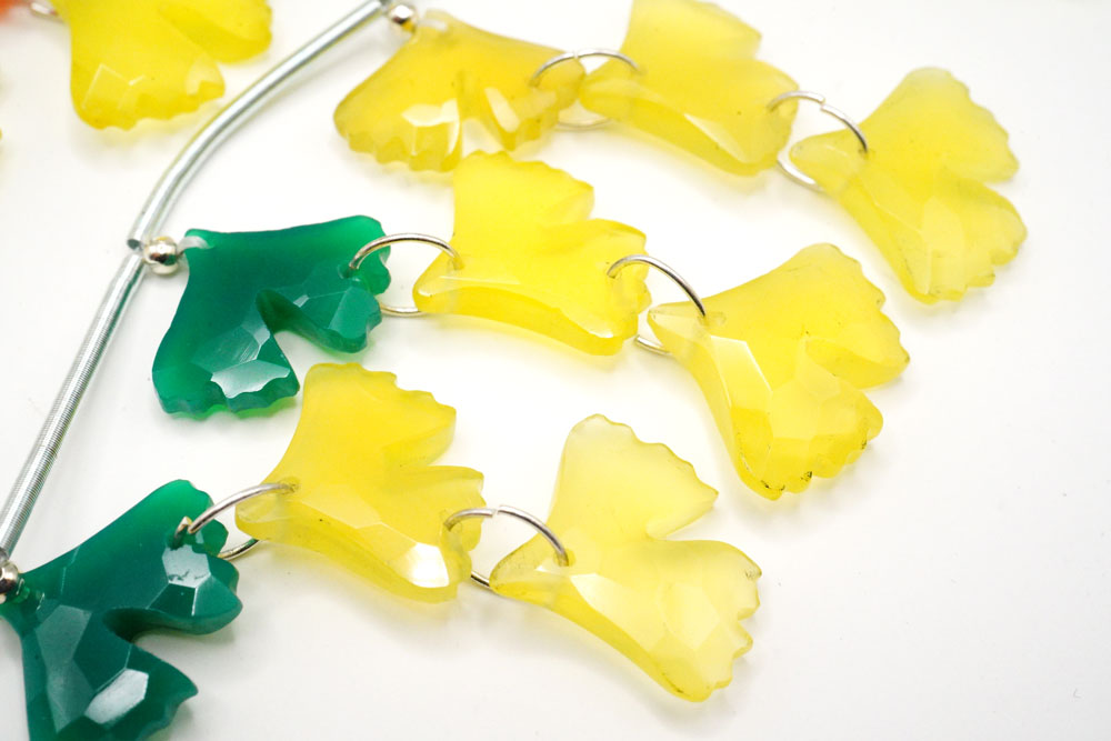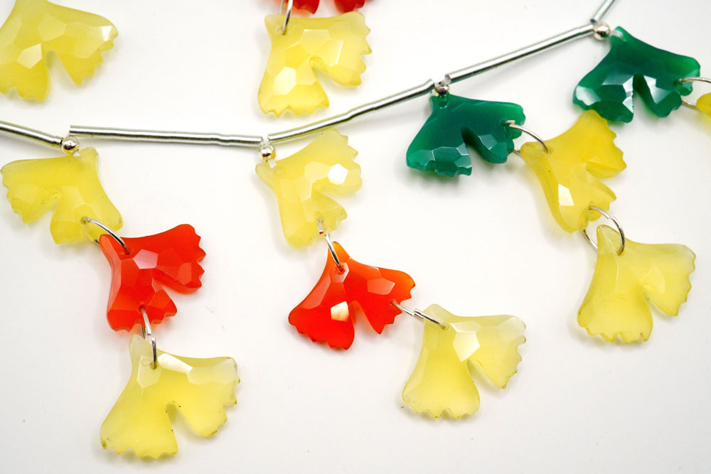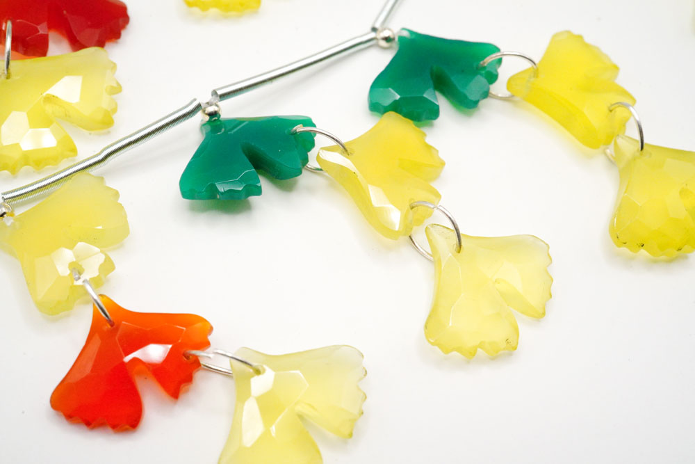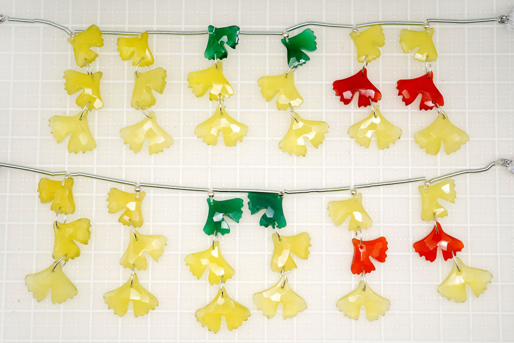 染めたオニキスを使って秋のイメージのイチョウの葉っぱのビーズをオーダーしました。ひらひらと舞う葉っぱに見えるよう穴の位置も工夫しています