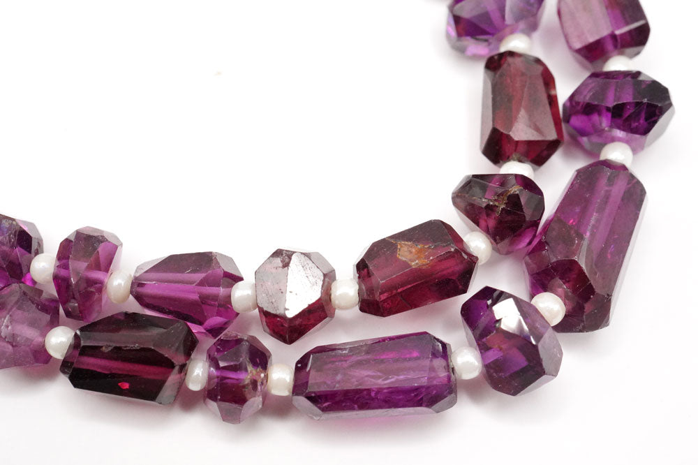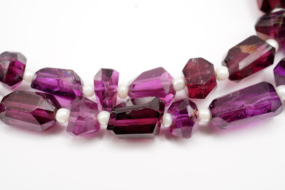 B.濃いルベライトのようなロードライトガーネットで作ったタンブルカット~ザクザクとしたチューブのような形が交互に入ったビーズです。ガーネット特有の細かな内部のキズが入ります。