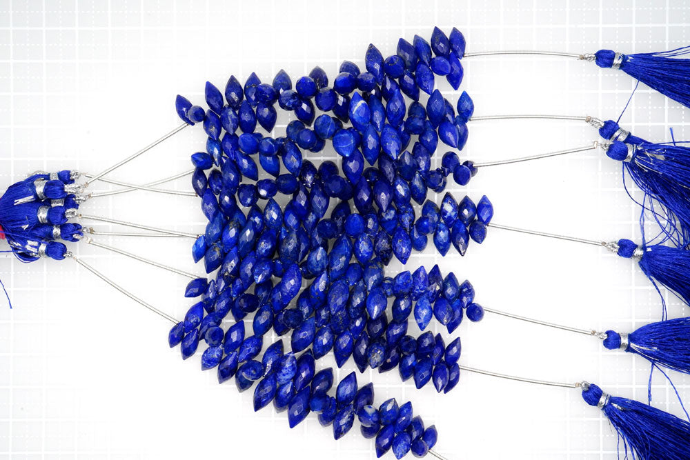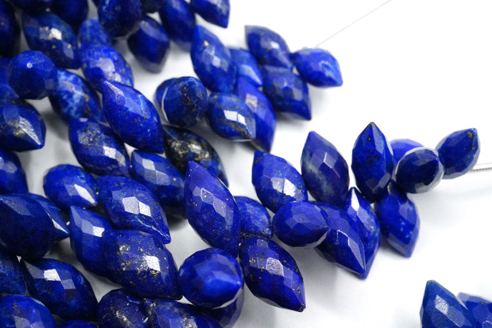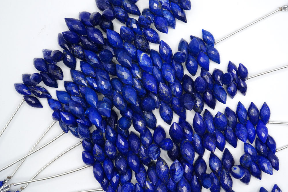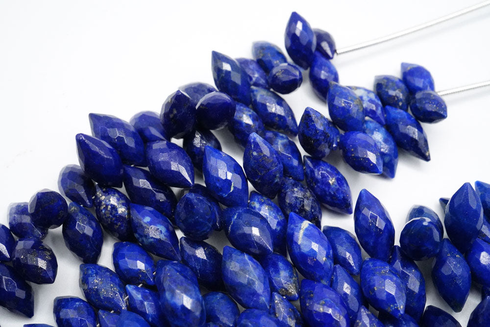 深い青とパイライトが魅力のラピスラズリのビーズ。シャープなマーキスカットでスッキリとした印象のデザインです。白いカルサイトの鉱物が入った部分も含みます。