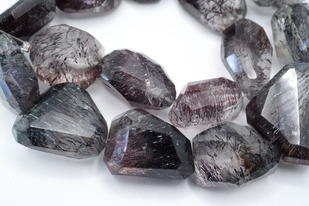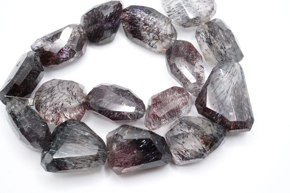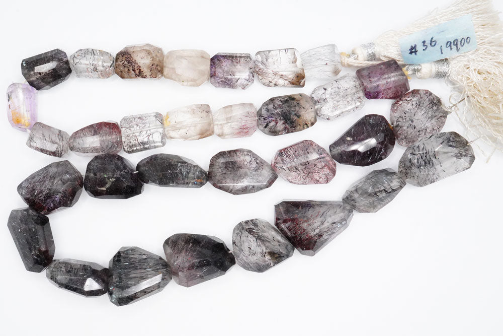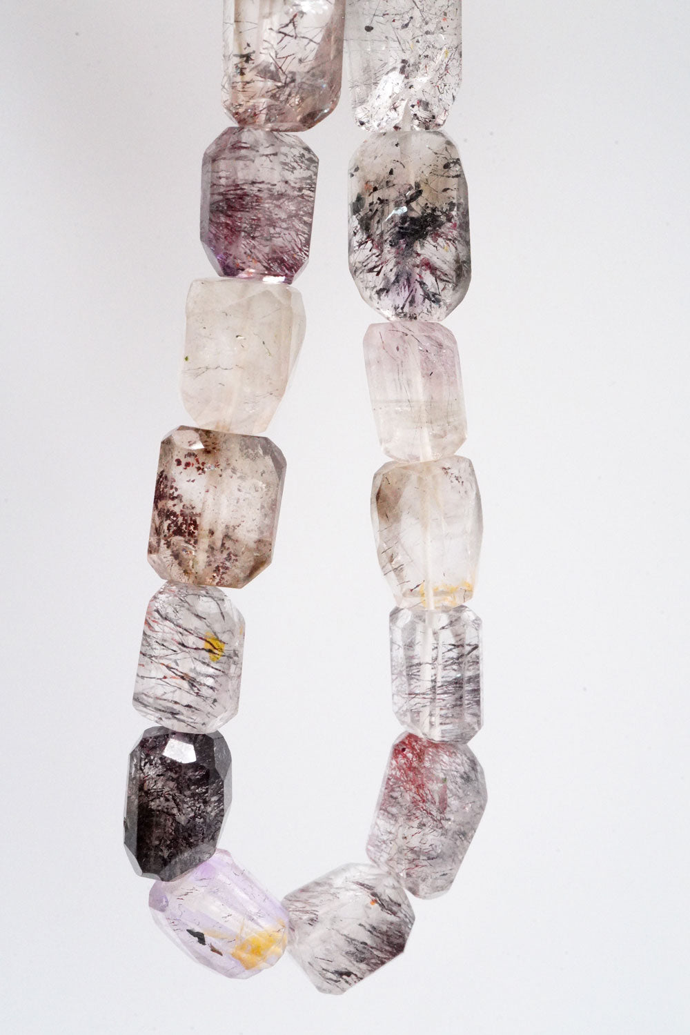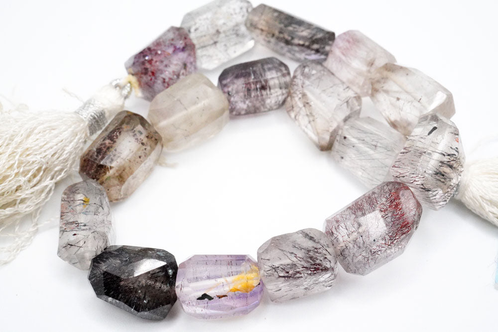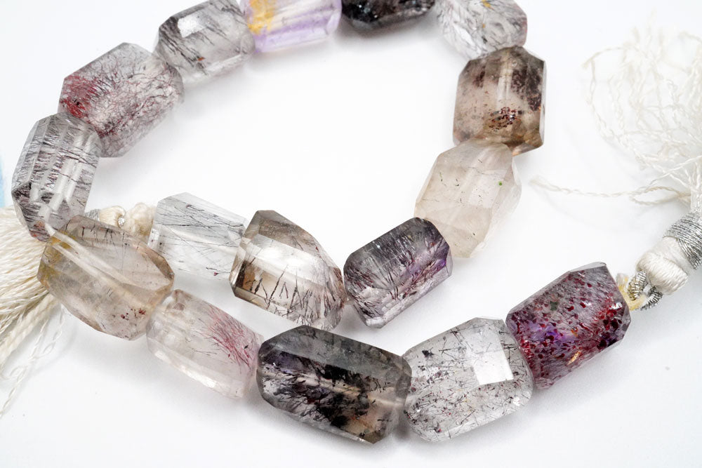 クリスタル、スモーキークォーツ、アメシストなどの水晶にレピドクロサイト、ゲーサイト、カコクセナイト、ルチルなどを内包した天然石です。スーパーセブンという名前でも有名な石です。 ひと粒ずつ含まれる鉱物や入り方が異なり、表情が豊かで面白い素材です。当商品は内包物が多い石のため、石をカットした際に内包物の隙間に空洞があったり、表面や内部にキズや曇った部分が多い石です。ご理解をお願いいたします。