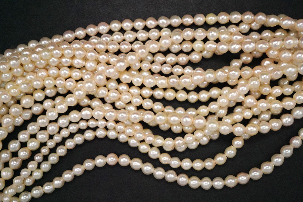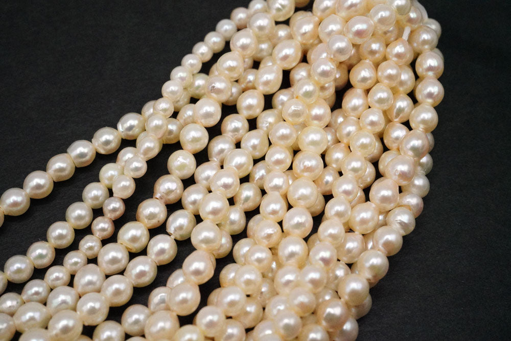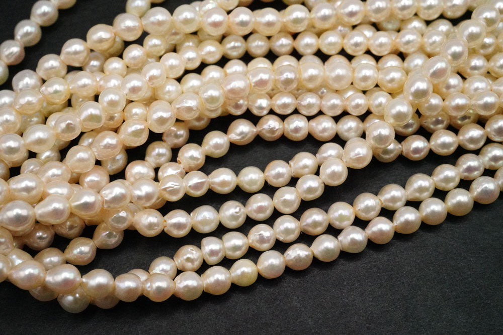 染め加工。バロックパールは、自然が生み出した唯一無二のフォルムと、光沢が強い連材です。あこや真珠の中でも、丸玉ではなくいびつな形状(=バロック)のチュラルな雰囲気の真珠です。