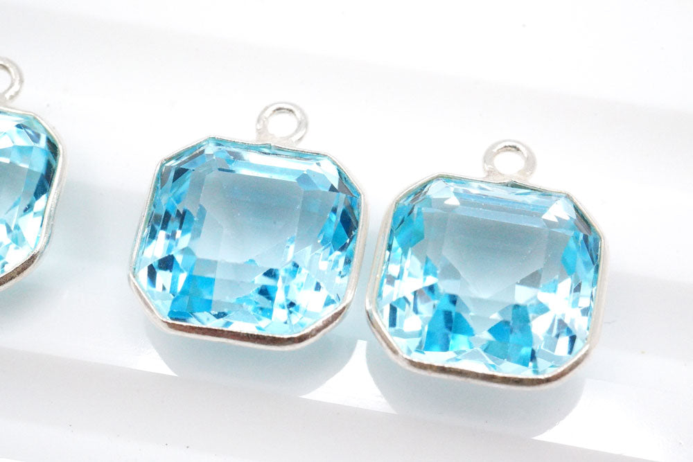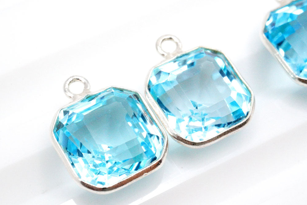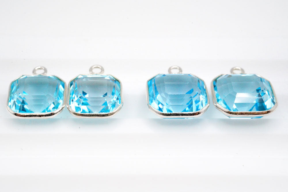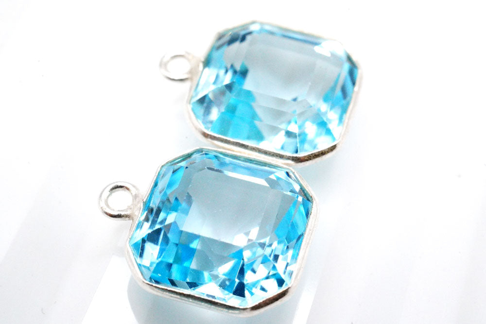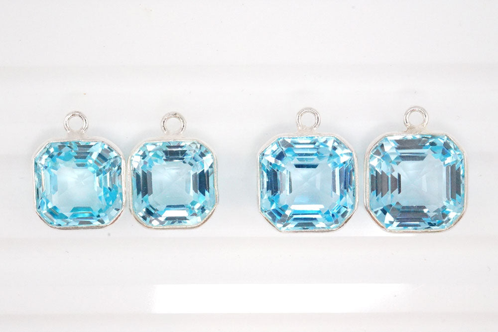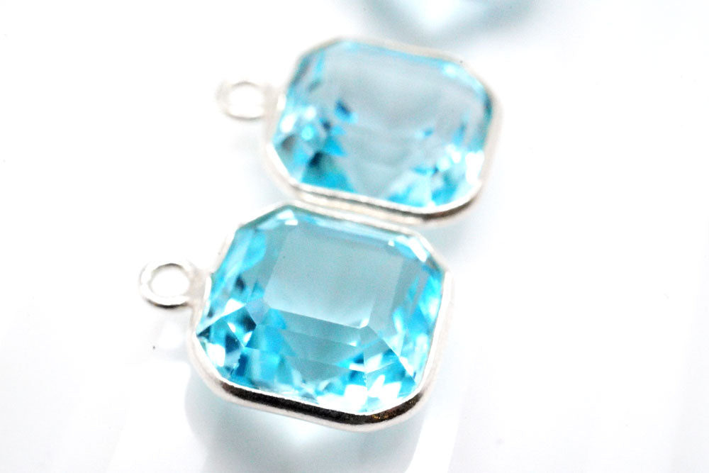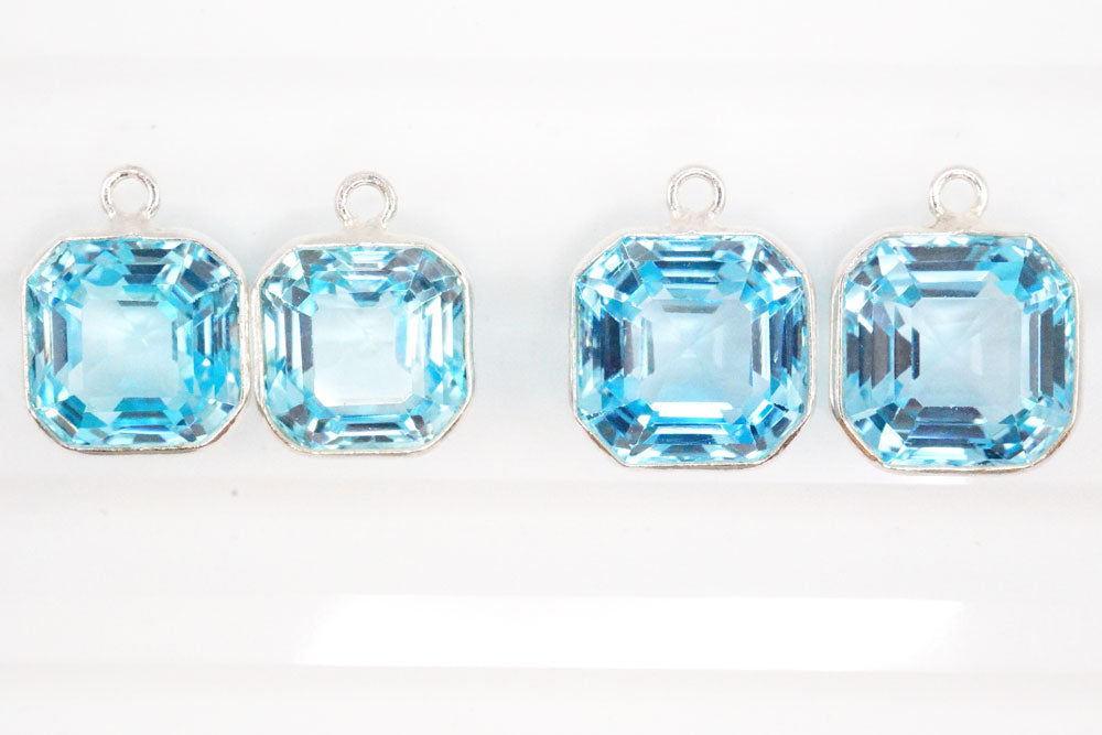 高い透明感と光沢感を持ち、涼しげな印象のスカイブルートパーズを使いシルバーでフレームを作ったペアチャームです。ルースカットのため裏面は尖ったキューレット部分がありテーブル面から光を受けてキラキラと輝きます。ホワイトトパーズを照射処理した石です。生地、メッキなしです。