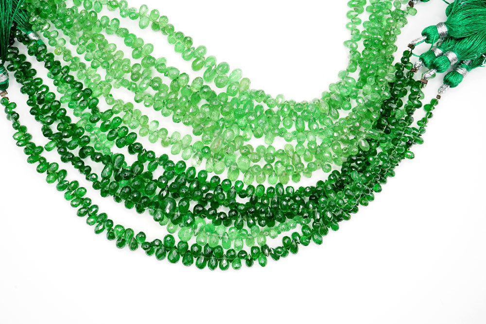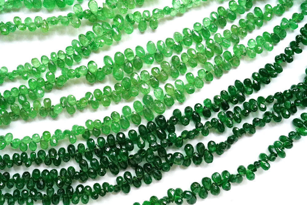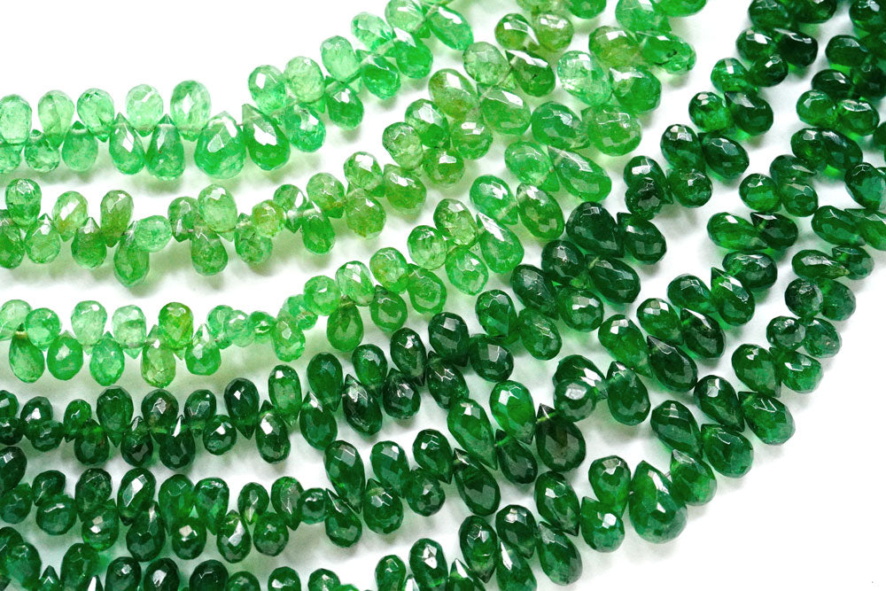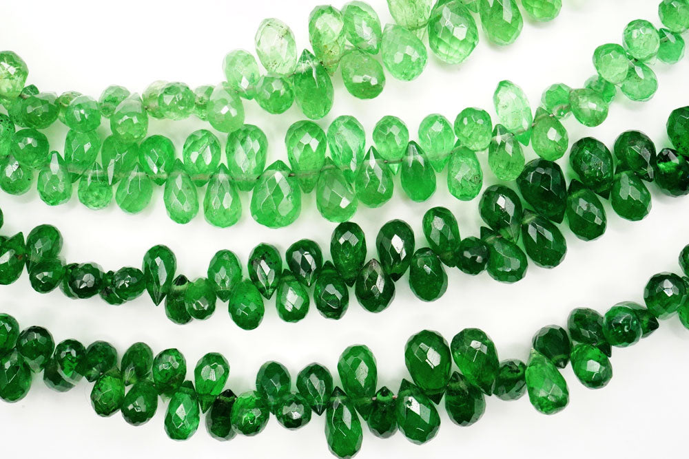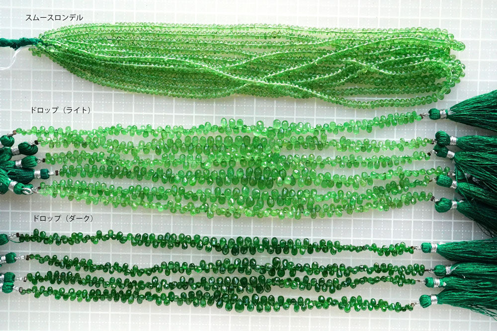 小粒のサイズグラデーションになったファセットドロップ。ツァボライトはガーネットの一種で、パナジウムやクロムを含有することで鮮やかな緑色になります。グロシュラーガーネットのうち緑色のものをツァボライト、またはグリーンガーネットと呼びます。