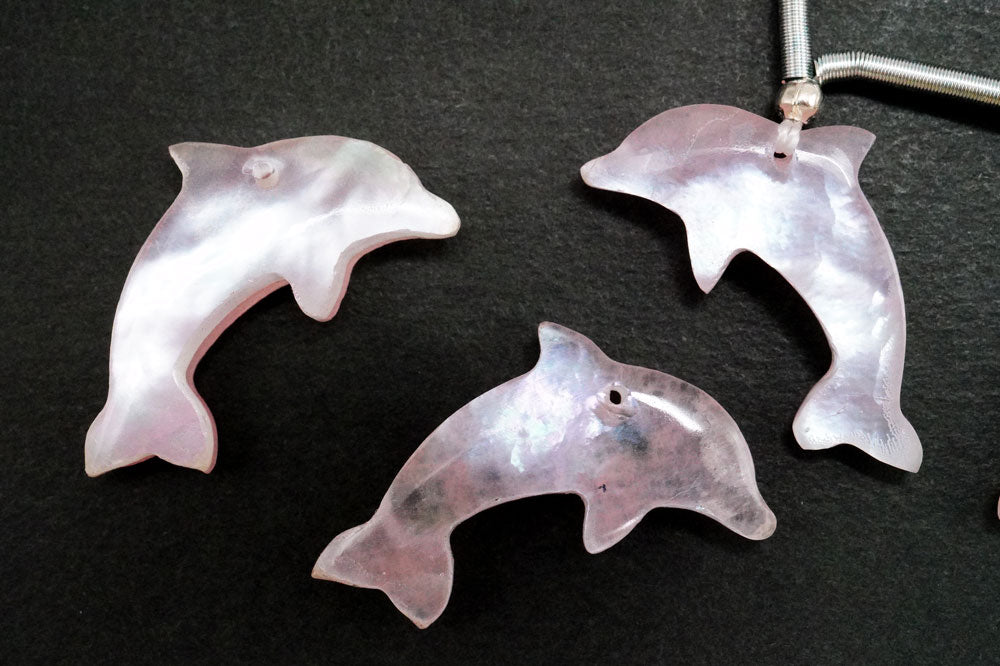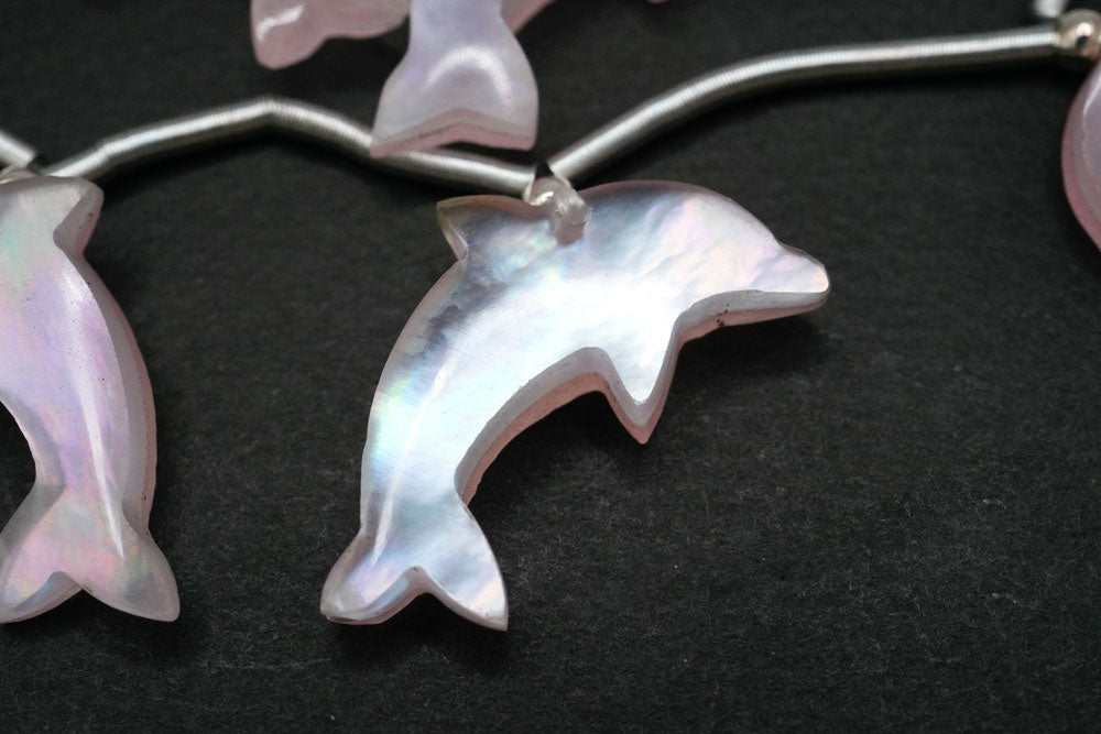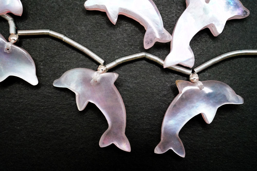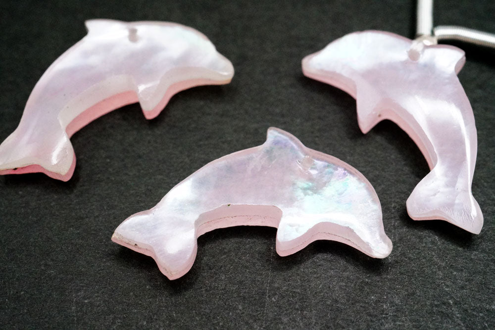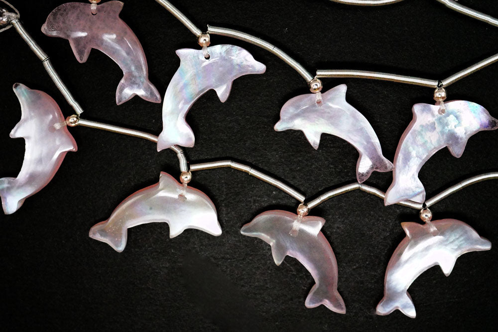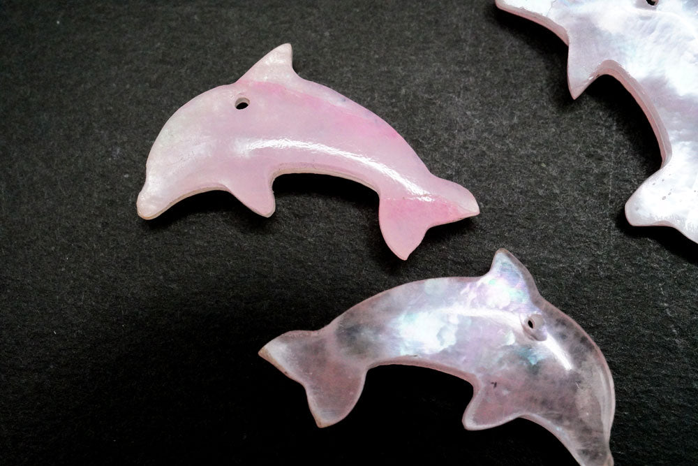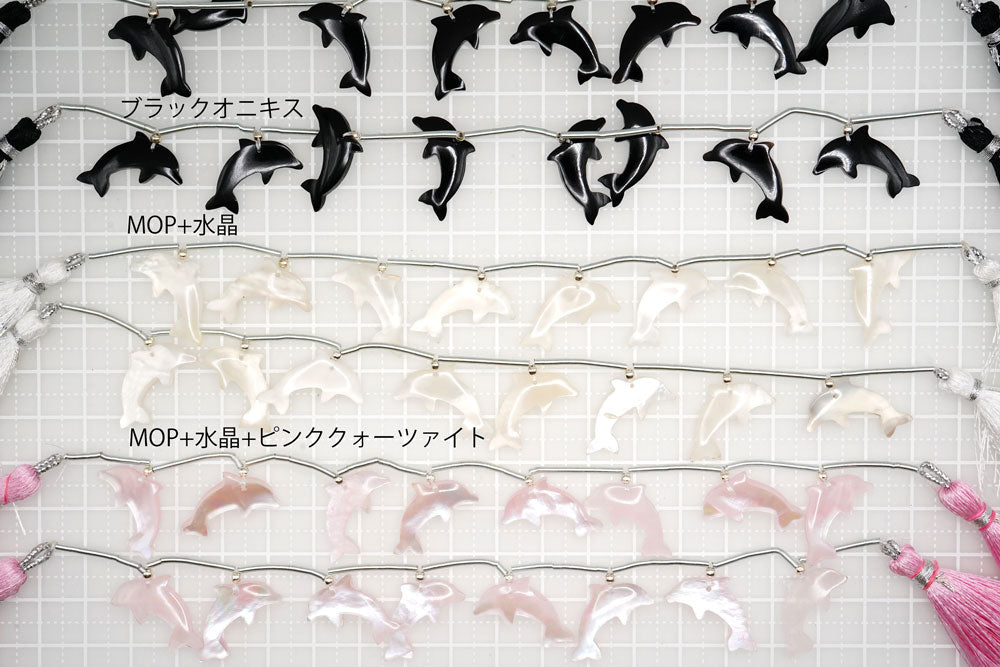 アマゾンのピンクイルカをイメージしてオーダーした躍動感のあるオリジナルビーズです。尾びれが細かくカットされているためカケにはお気をつけください。上からクリスタル+マザーオブパール+クォーツァイトを貼り付けた手の込んだ商品で、クォーツァイトはクォーツの仲間です。マザーオブパールは天然のため虹色がでているものとそうでないものが混じっています。