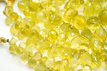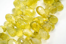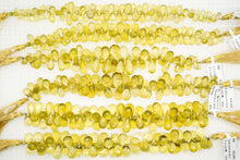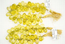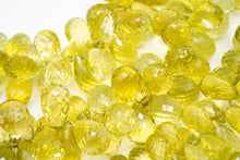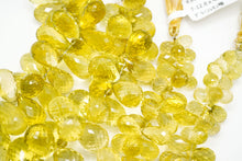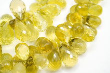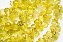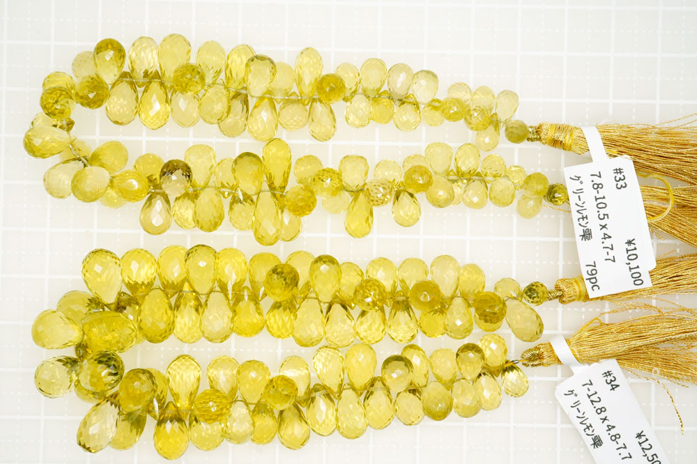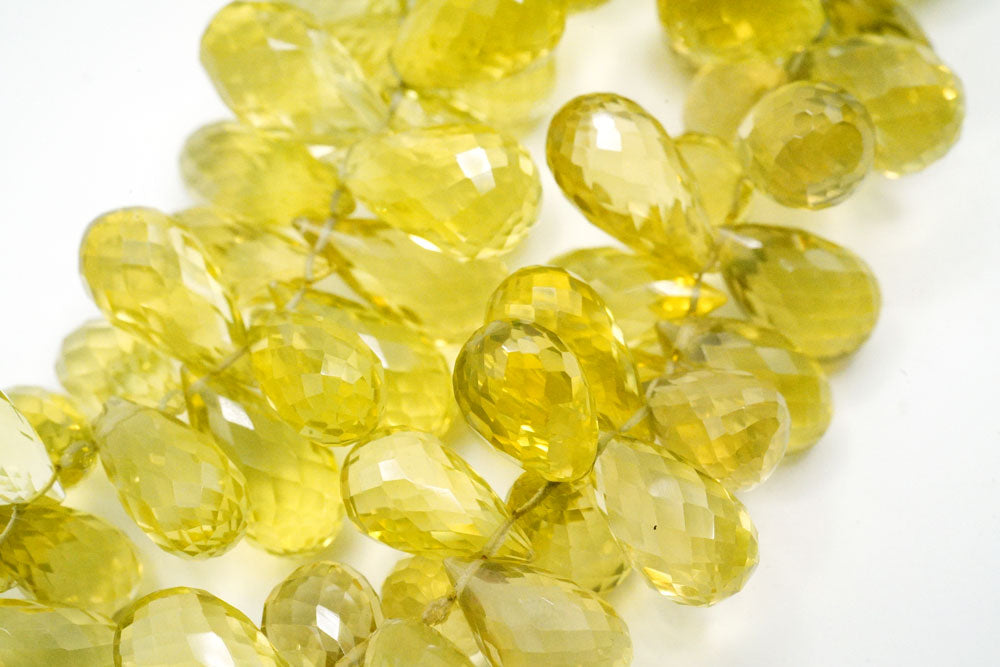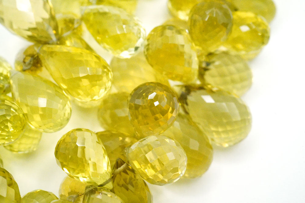 透明感あり、グリーンがかったゴールドのレモンクォーツドロップ。目立つキズの無いカット、ポリッシュ良好の高品質ビーズです。量り売り。