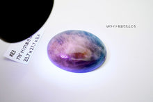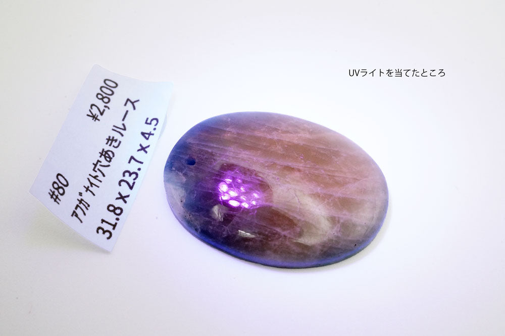 アフガナイトは青や白が混じった色で、UVライトでオレンジやピンクに蛍光するのが特徴の石です。脆い石のため、お取り扱いにはお気をつけください。裏面くぼみ入ります。