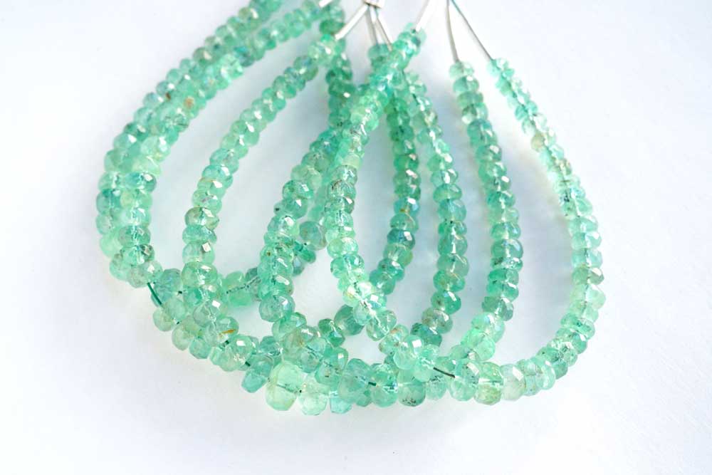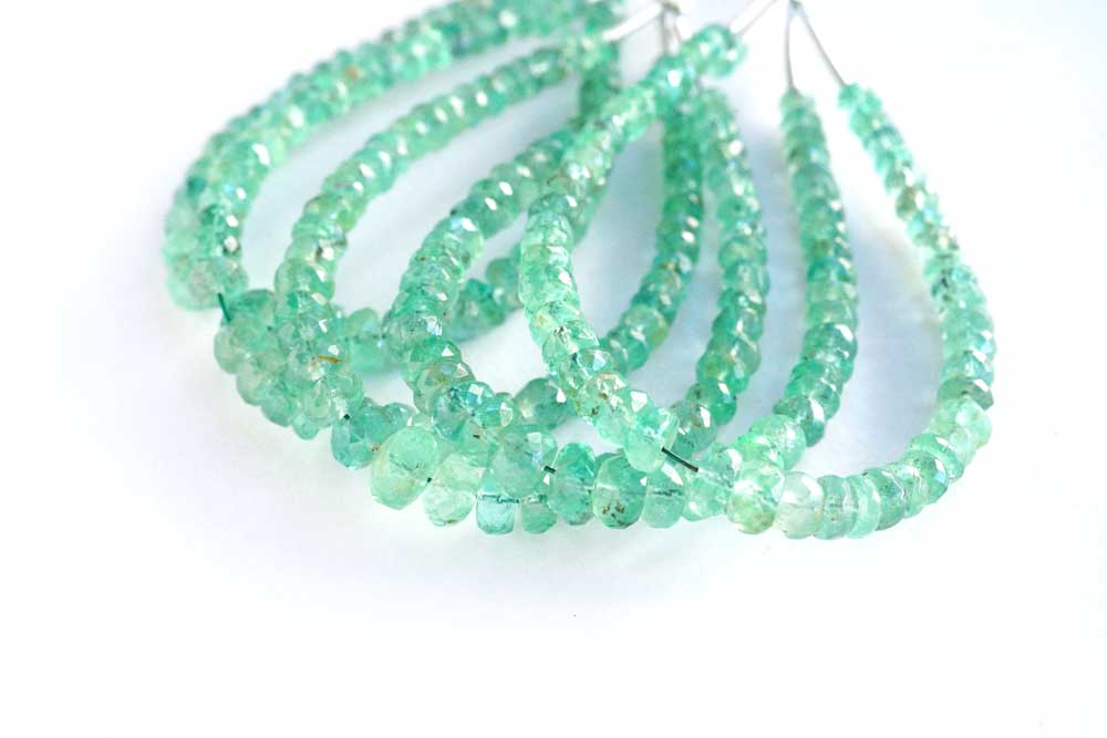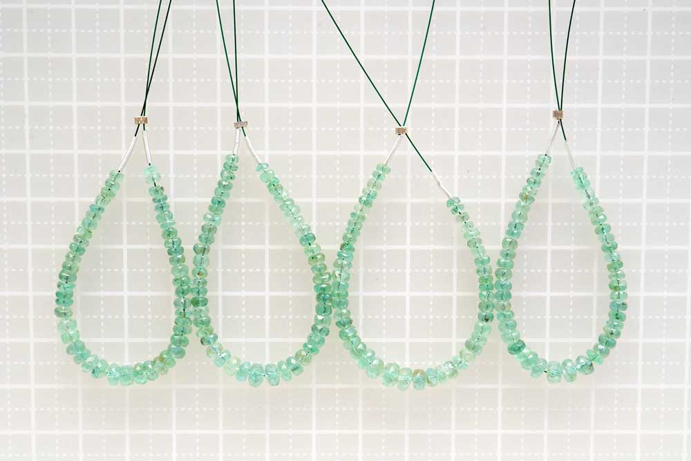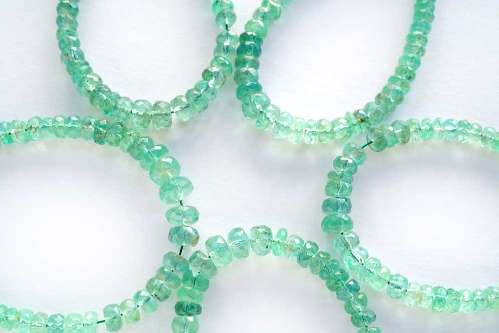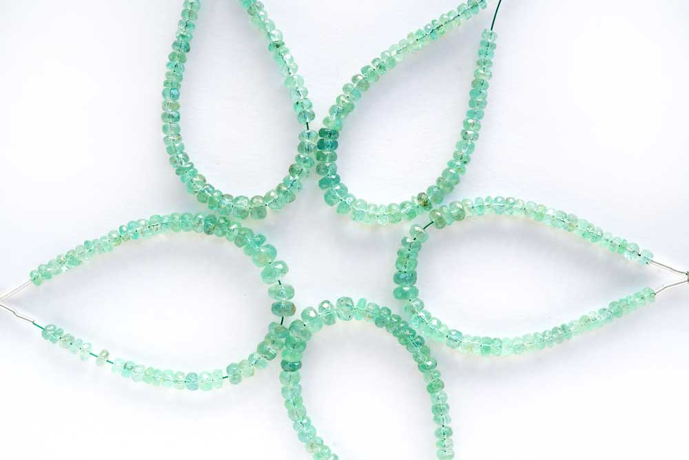 透明感のある青みの強いザンビア産のエメラルドのボタンカットビーズ。高級なビーズを少量でお届けします