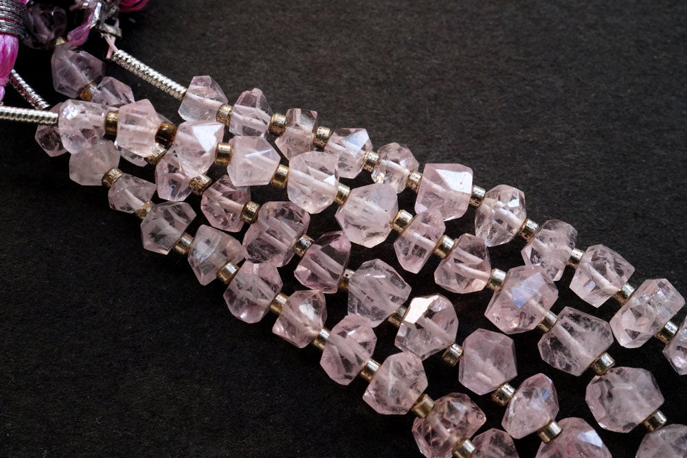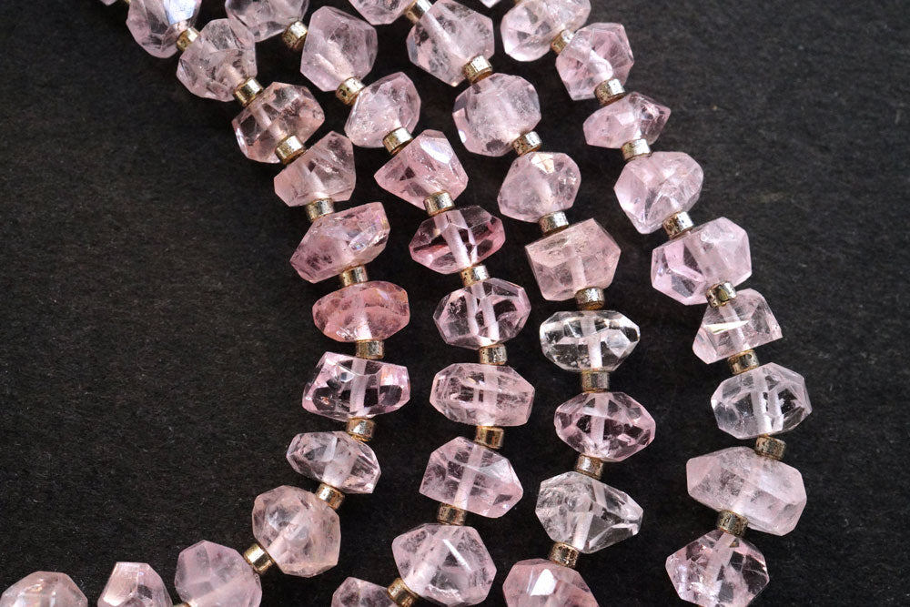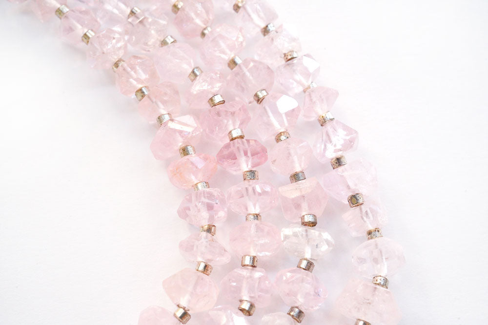 ピンクアクアマリン/モルガナイトのファセットタンブル/ナゲットビーズです。モルガナイトはインクルージョンを多く含み、ビーズでは半透明から不透明が多いのですが、こちらは透明〜半透明の良質の原石から作られています。