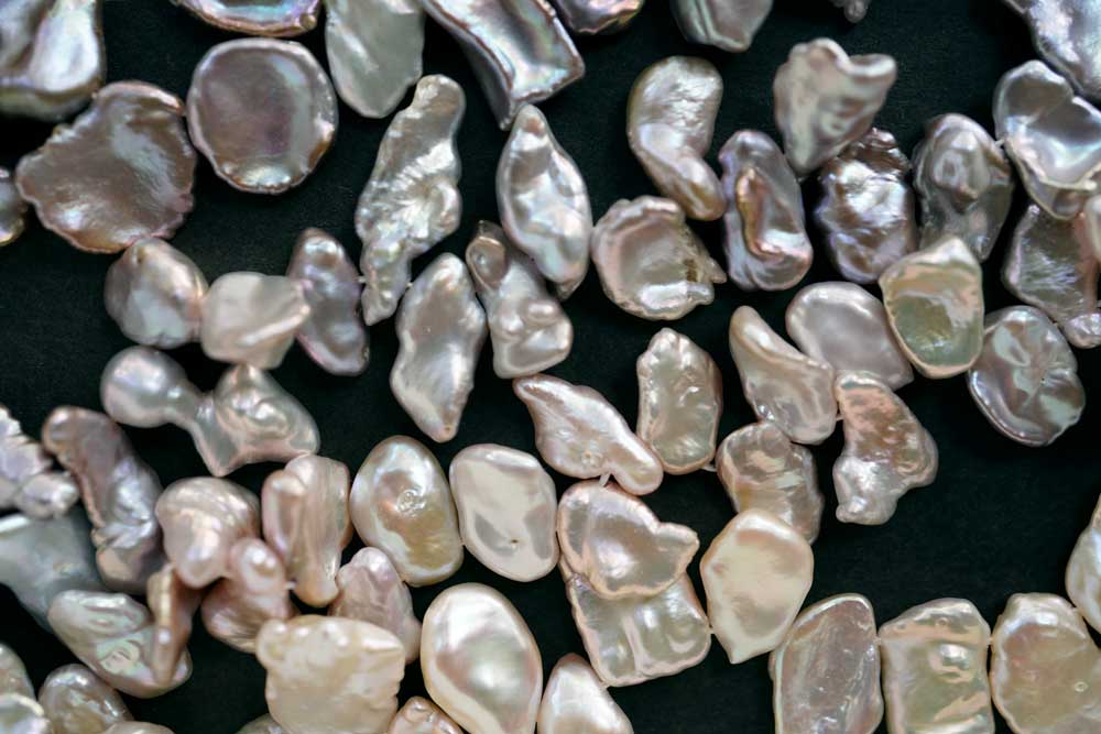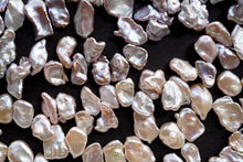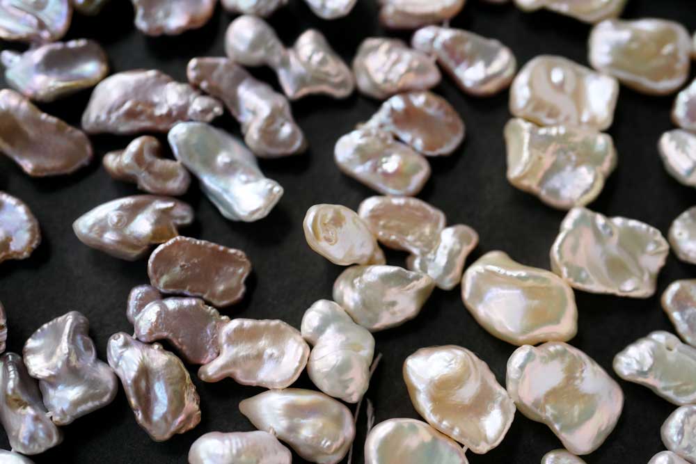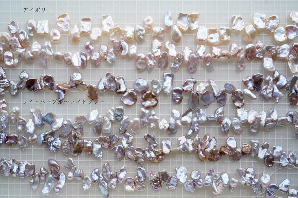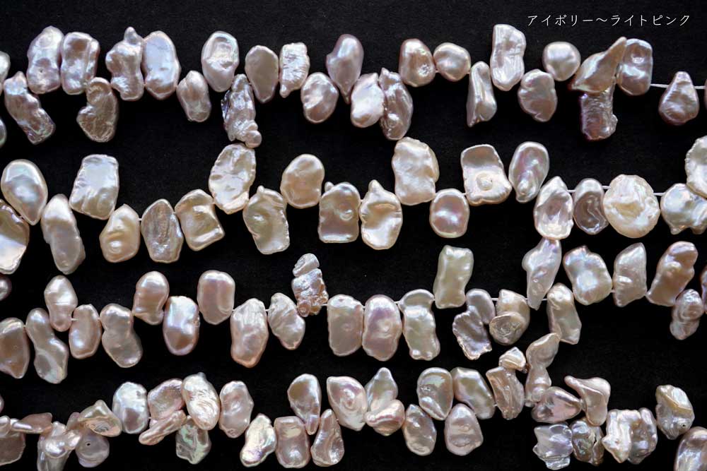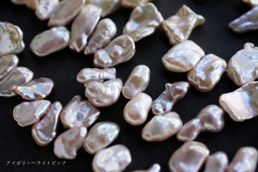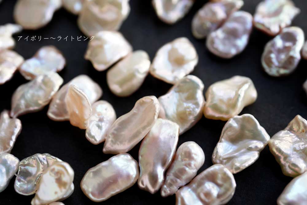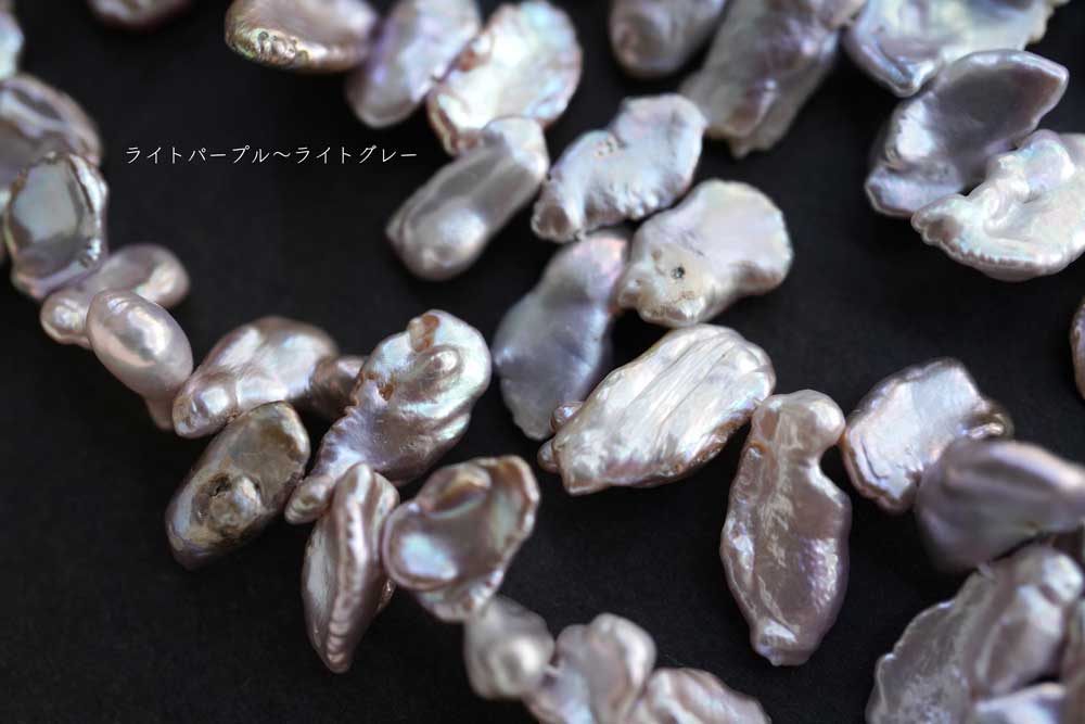 ユニークなシェイプのバロックパール。上部にクレオ穴があいたナチュラルな雰囲気のくしゃっとしたパールです。パープルをお選びの方にはゴールドがかった粒入からお出しします。また、アイボリー〜ライトピンクはビワ風パールを含みます
