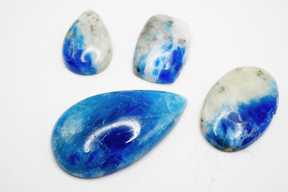 アフガナイトは青や白が混じった色で、UVライトでオレンジやピンクに蛍光するのが特徴の石です。脆い石のため、お取り扱いにはお気をつけください。裏面くぼみ入ります。