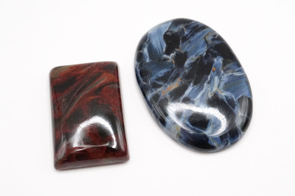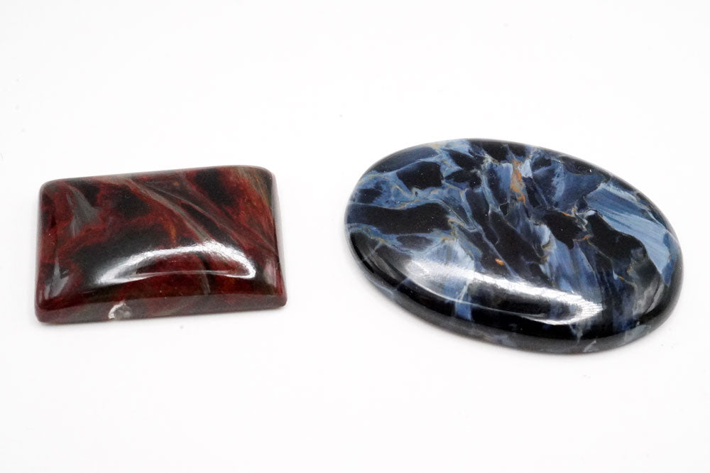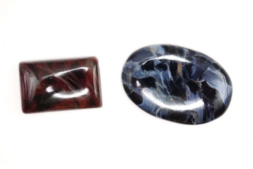 ブルー、ネイビー、ベージュ、ホワイトなどが油絵のように複雑に混じったピーターサイトのカボションルースです。つややかで、タイガーアイのようなキャッツ効果もしっかり見られる上質のお品です。少し透明感のある粒もございます。ホークスアイやタイガーアイがブレッシア状(破砕され再結合した構造)に混ざった、非常にユニークな天然石です